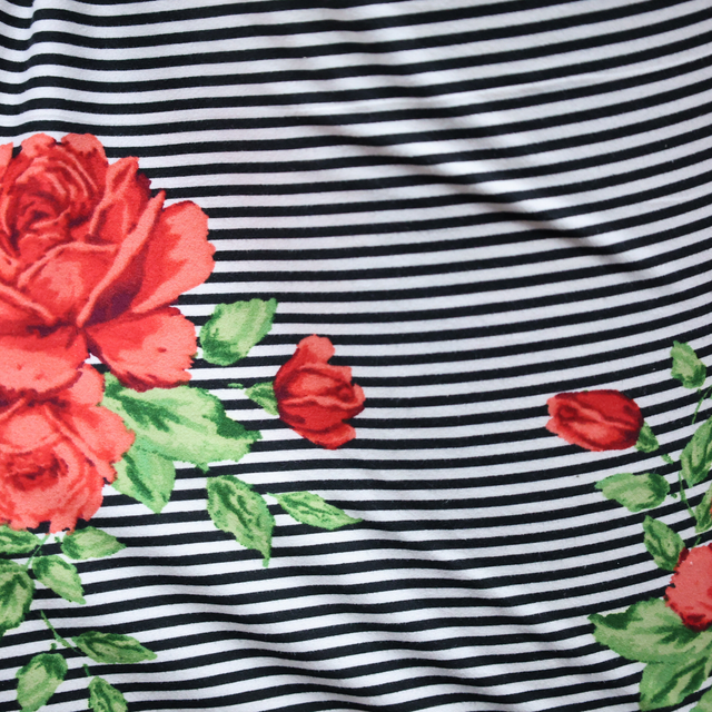 Double Brushed Jersey Knit Fabric,Black/White Stripe with Red Rose Floral(#IT611) - By The Yard