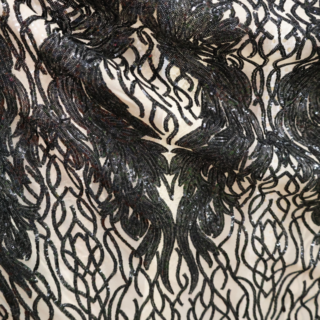 This Black Sequin Embroidered Mesh Fabric features an intricate abstract design embroidered with shimmering black sequins over a sheer nude mesh base. The bold contrast between the dark sequins and the light background creates a striking and elegant look, perfect for statement garments and eveningwear. Lightweight and semi-sheer, this fabric drapes beautifully and adds instant glamour.