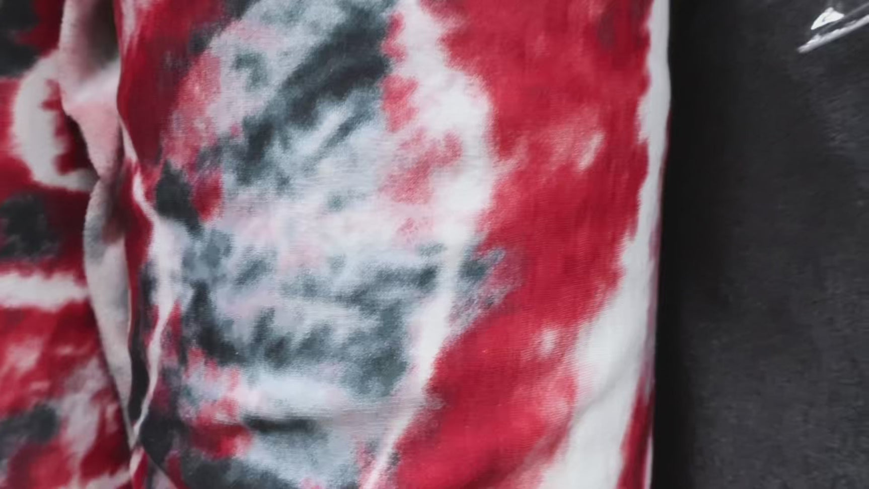 This fabric combines the comfort of jersey knit on the outside with a warm brushed fleece backing on the inside. Featuring a bold red, black, and white tie-dye pattern, it offers both style and coziness. Perfect for casual wear and loungewear.