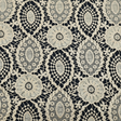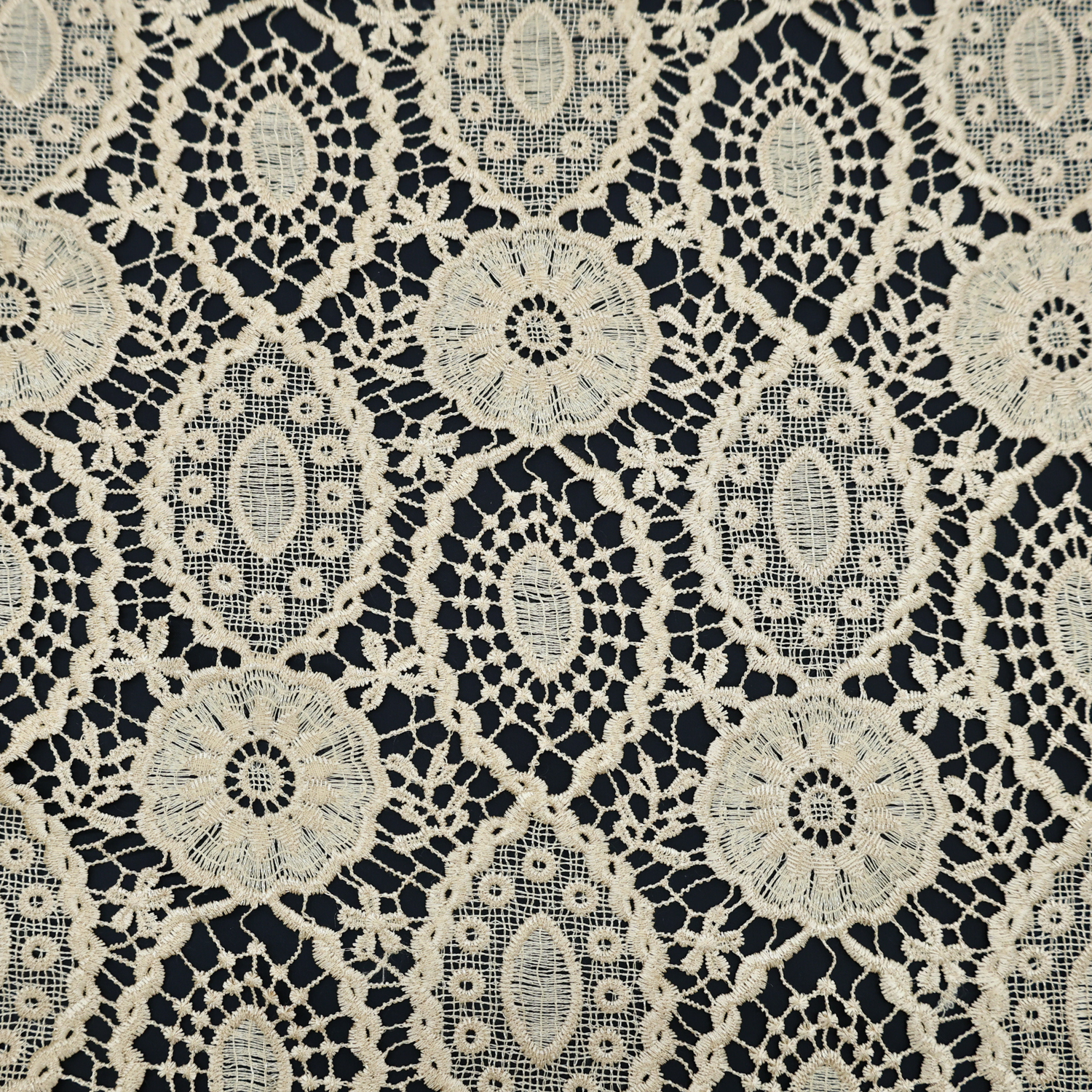 This elegant lace fabric features an intricate pattern of alternating oval and circular motifs, connected with delicate floral-inspired embroidery. The openwork design creates a light, airy texture, perfect for adding a romantic and timeless touch to garments, décor, and special occasion projects. Ideal for dresses, overlays, blouses, table settings, and DIY crafts.