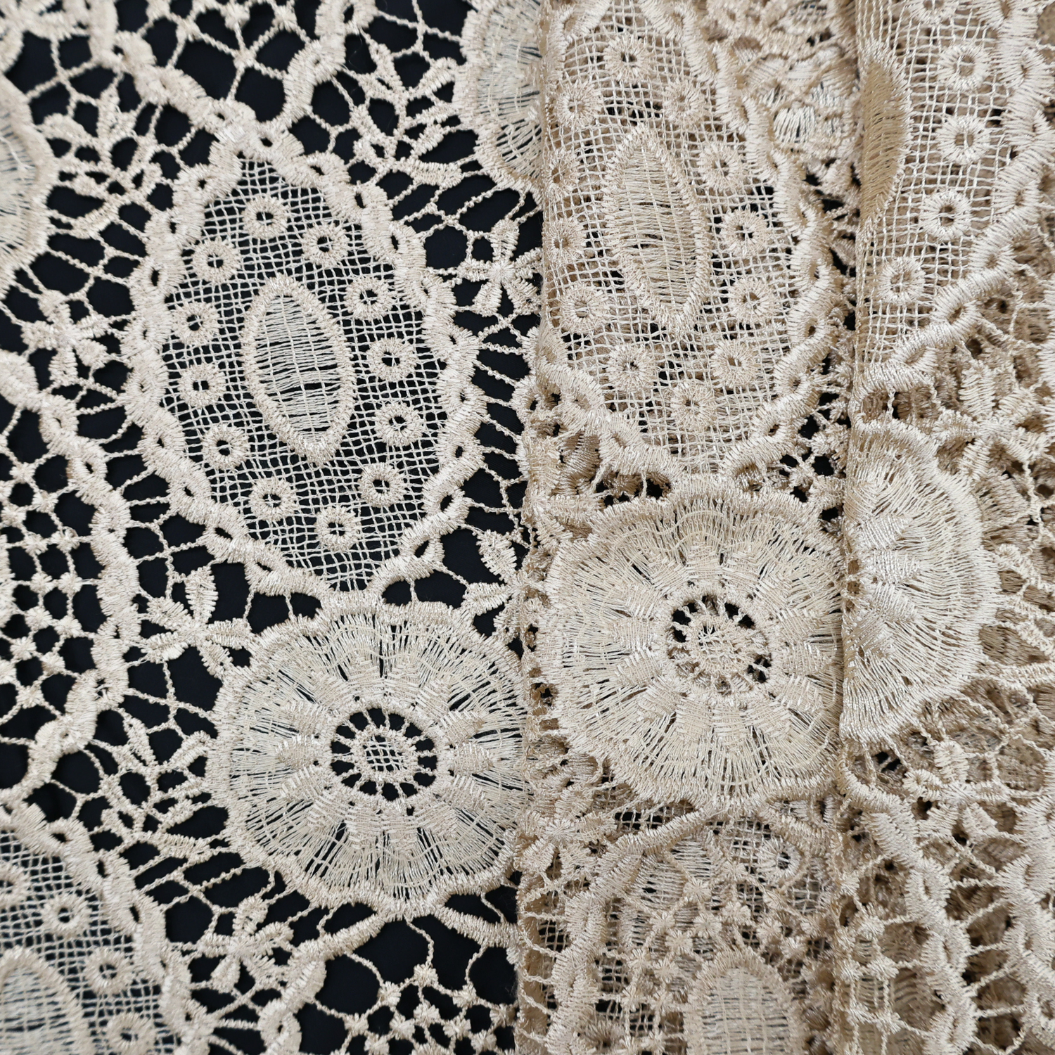 This elegant lace fabric features an intricate pattern of alternating oval and circular motifs, connected with delicate floral-inspired embroidery. The openwork design creates a light, airy texture, perfect for adding a romantic and timeless touch to garments, décor, and special occasion projects. Ideal for dresses, overlays, blouses, table settings, and DIY crafts.