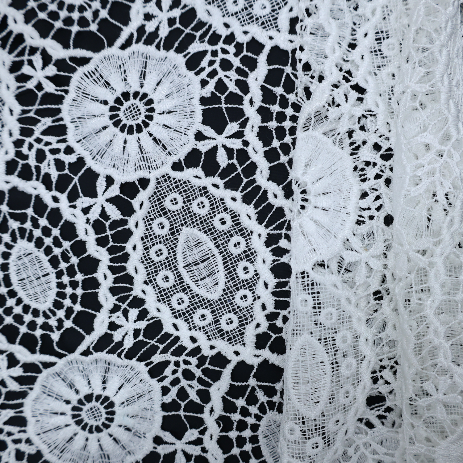 This elegant lace fabric features an intricate pattern of alternating oval and circular motifs, connected with delicate floral-inspired embroidery. The openwork design creates a light, airy texture, perfect for adding a romantic and timeless touch to garments, décor, and special occasion projects. Ideal for dresses, overlays, blouses, table settings, and DIY crafts.