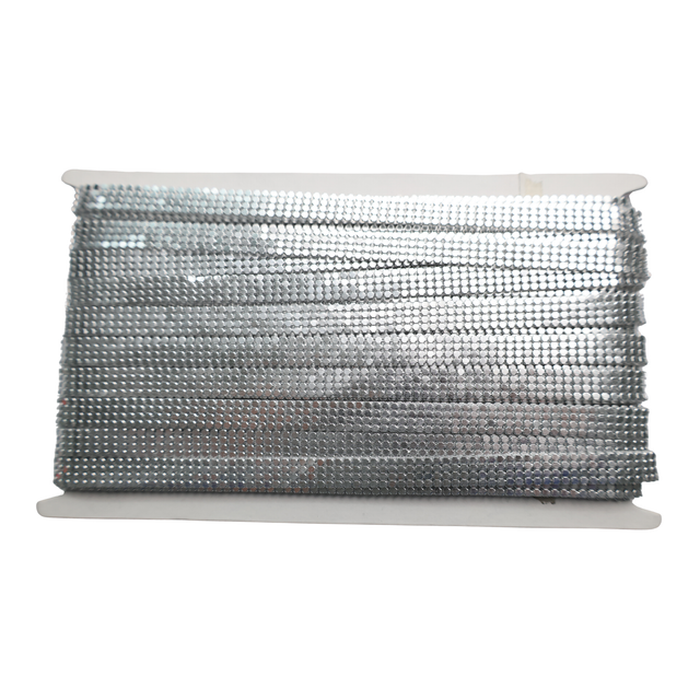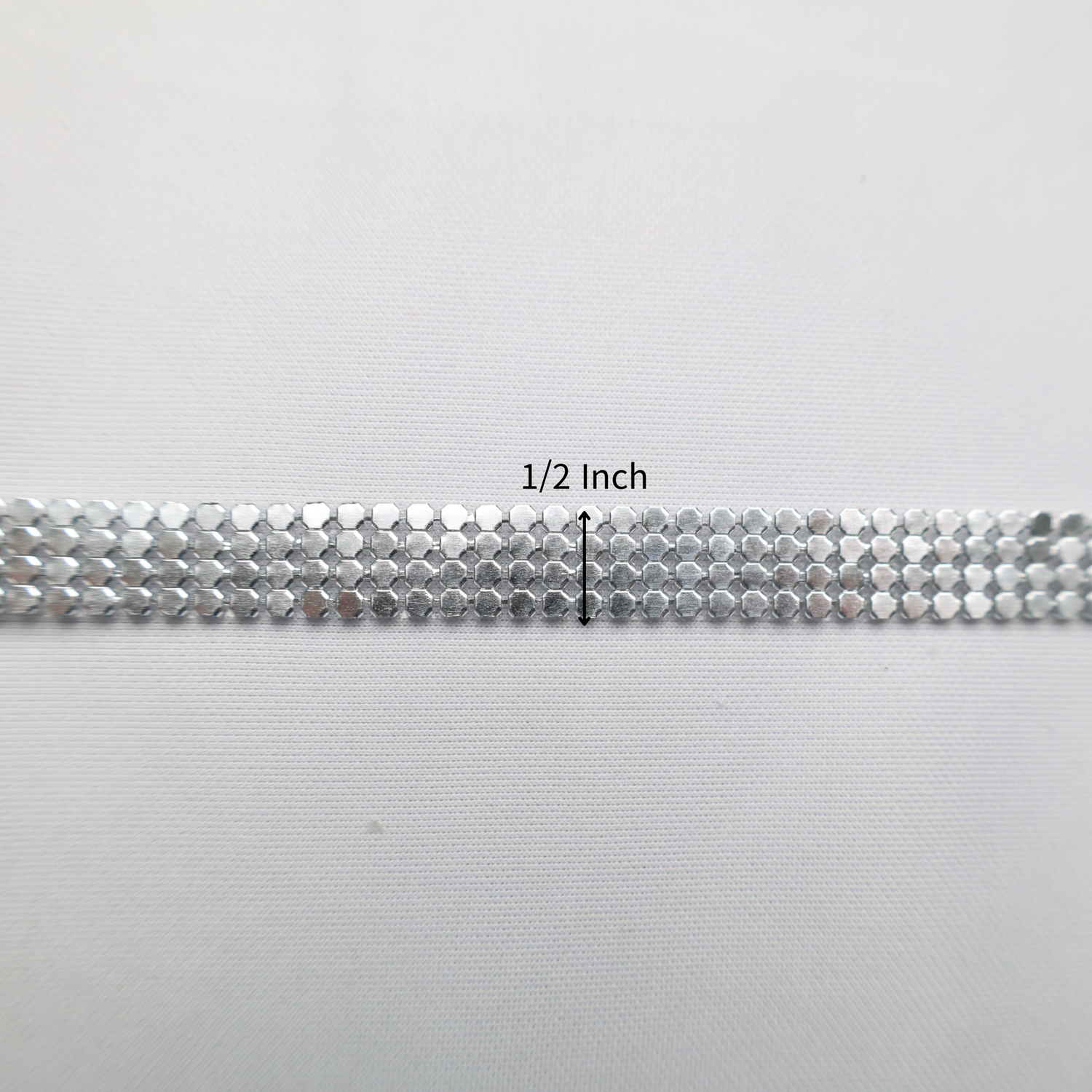 This decorative trim is crafted from tiny hexagon-shaped metal pieces, linked together to form a sleek mesh design. Its genuine silver metallic finish delivers a bold, reflective shine, perfect for fashion and décor projects that need a modern, eye-catching accent. Sturdy yet flexible, this trim can be easily sewn or glued onto fabrics and accessories.