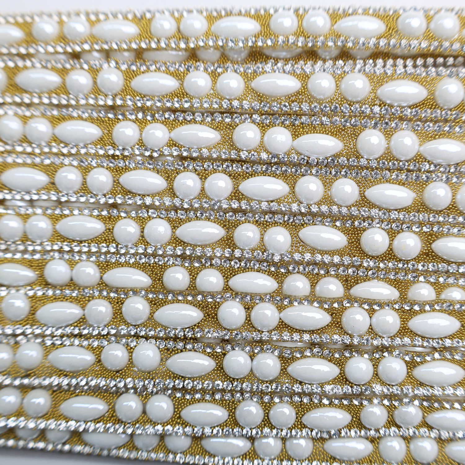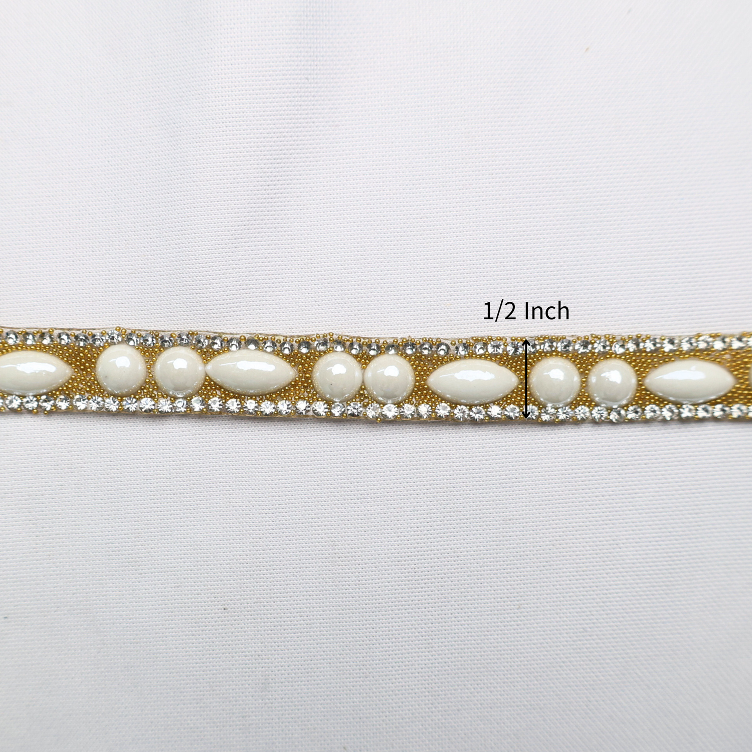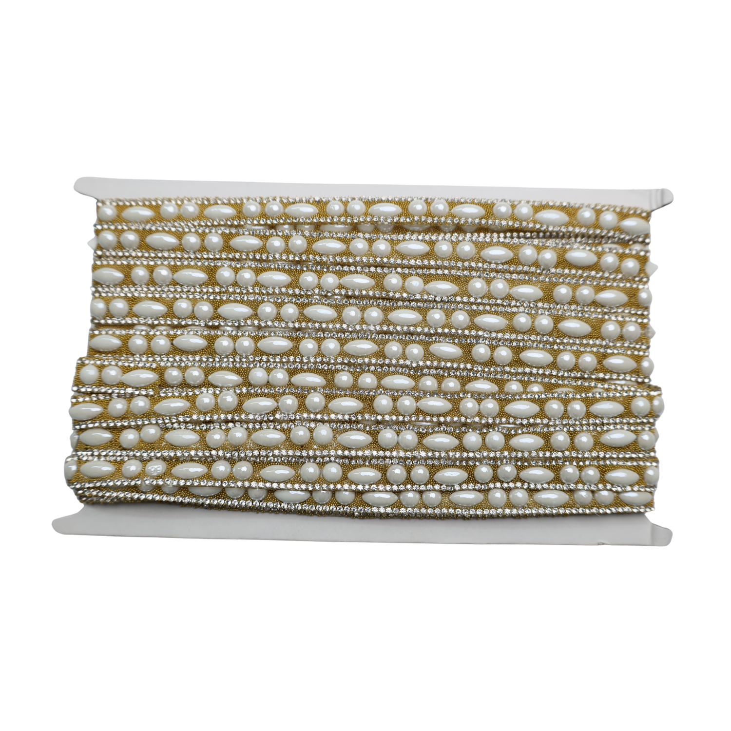 This luxurious trim features alternating round and oval pearls set on a golden base, framed by sparkling rhinestones. The mix of pearl shapes and crystal shine adds elegance and glamour, making it ideal for prom dresses, evening gowns, accessories, footwear, and decorative projects. Soft yet durable, this trim can be sewn or glued for versatile applications.