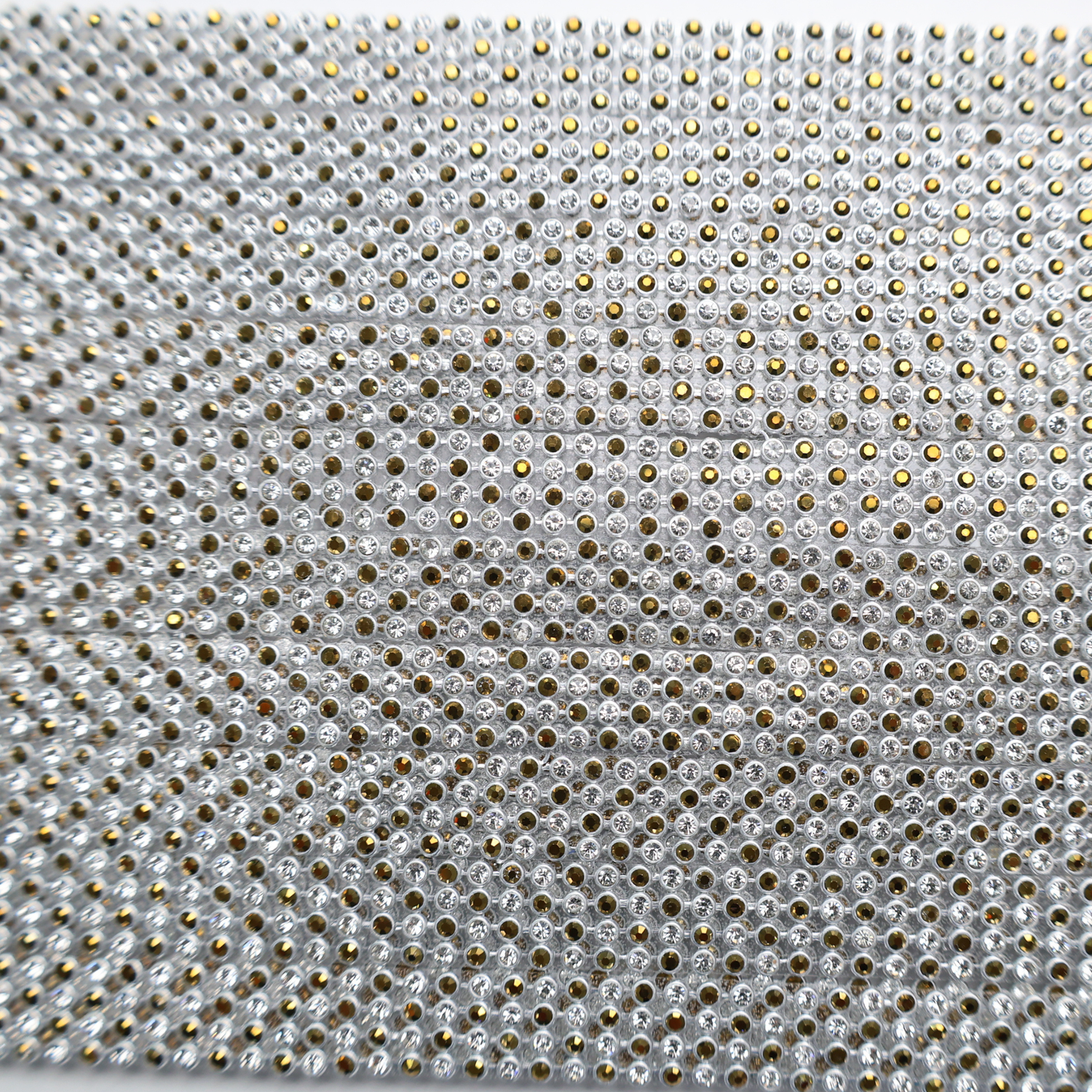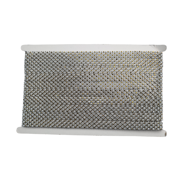 This decorative trim features two rows of sparkling clear rhinestones set on a metallic silver base with subtle golden accents. The unique combination of silver brilliance and golden undertones adds depth and richness to the design. Slim and elegant at 0.5 inch width, it is perfect for adding a refined sparkle to gowns, sarees, handbags, belts, footwear, and decorative projects.
