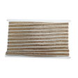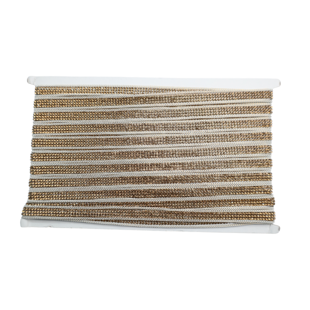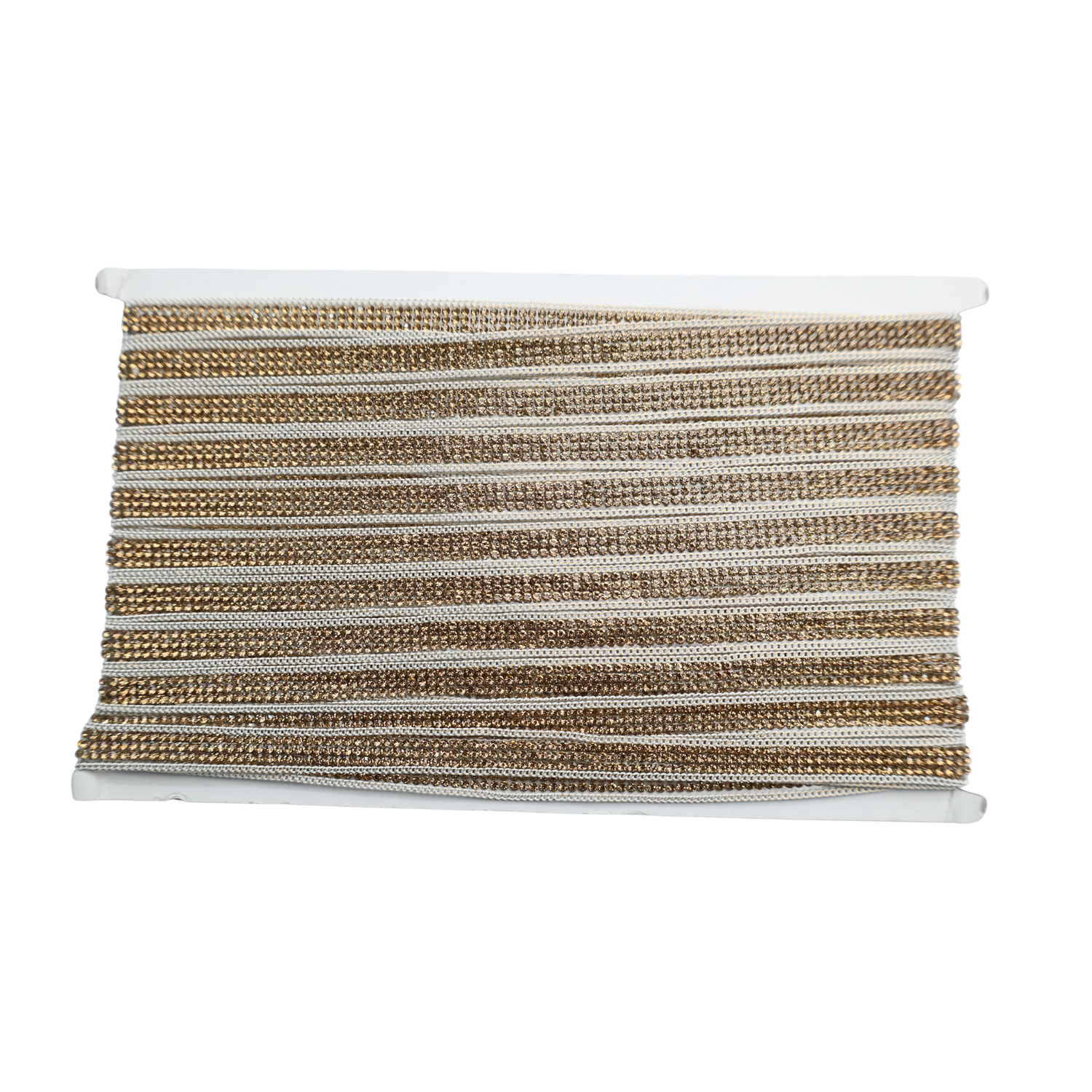 This decorative trim features a dense arrangement of gold bugle beads intricately set between two rows of metallic chain. The combination of tiny cylindrical beads and chain edges creates a rich and textured look, perfect for elevating garments, accessories, and décor projects. Flexible yet sturdy, this trim can be sewn or glued with ease.