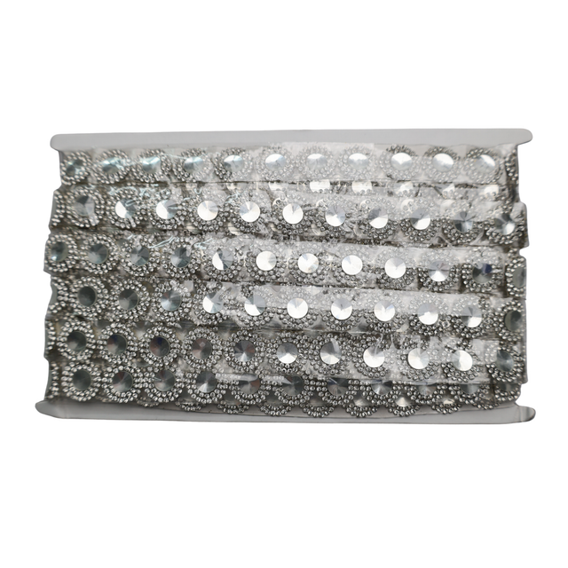 This sparkling trim features large round crystals encircled by smaller rhinestones, creating a radiant circular design. Set on a clear plastic tape, it provides both flexibility and durability while maintaining a clean finish. With its reflective shine and elegant arrangement, it adds glamour and sophistication to evening gowns, prom dresses, wedding attire, handbags, footwear, and decorative projects.