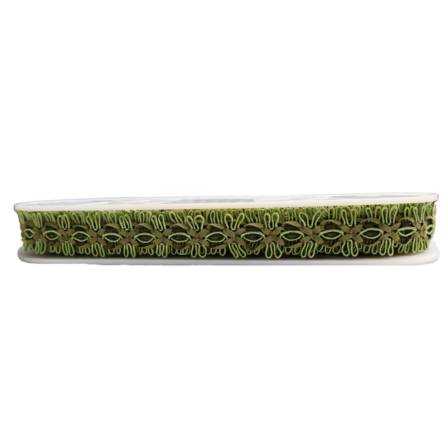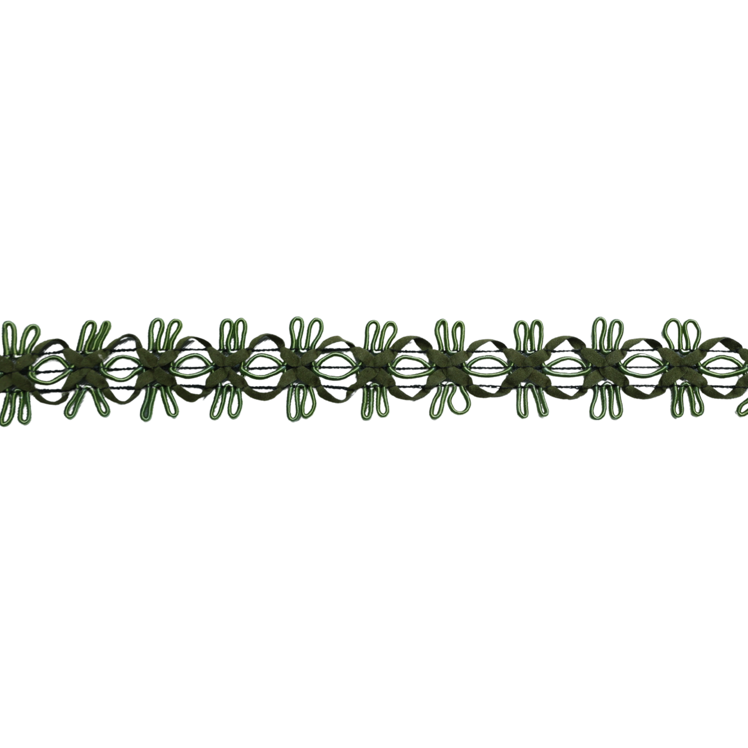 This elegant trim features an intricate looped pattern in an olive green shade, perfect for adding refined detail to apparel, accessories, and craft projects. The flexible construction offers a soft feel with slight stretch, making it easy to sew and ideal for decorative edging.