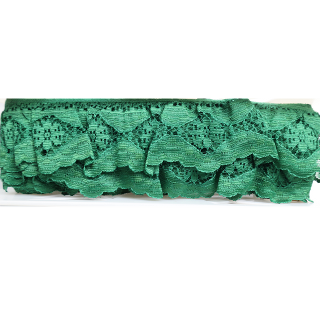 This beautiful lace ruffle trim features rich green layers with a scalloped edge, adding volume and elegance to any design. Made from 100% nylon, it offers a soft texture with excellent durability, making it ideal for dresses, skirts, costumes, dancewear, accessories, and decorative craft projects. The layered construction gives a full, dimensioned look that enhances movement and detail.