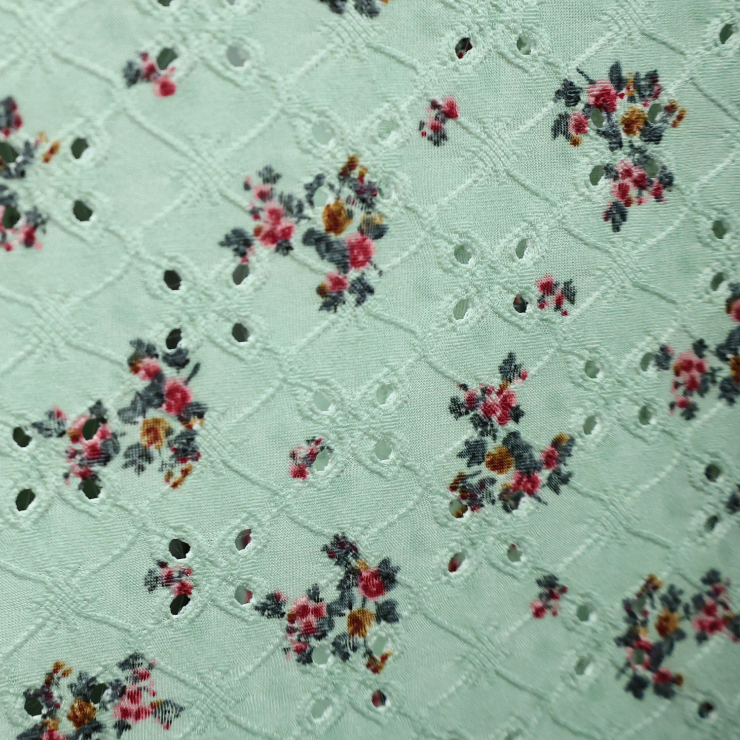 This stretch embroidered eyelet fabric features a delicate punched design combined with soft floral detailing, offering both breathability and gentle stretch. Lightweight and comfortable with a smooth drape, it adds a fresh, airy texture to any project. Easy to sew and versatile, this fabric is perfect for tops, dresses, skirts, summer outfits, and stylish layering pieces.