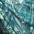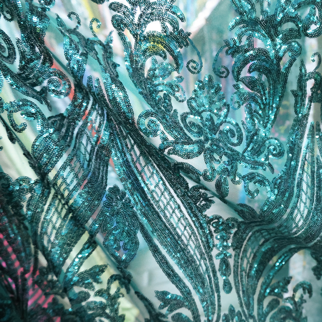 This Emerald Green Sequin Embroidered Mesh Fabric showcases an ornate damask-inspired pattern with shimmering emerald green sequins embroidered onto a sheer mesh base. The vibrant green sparkle adds a luxurious and eye-catching finish, perfect for creating statement garments and glamorous eveningwear.