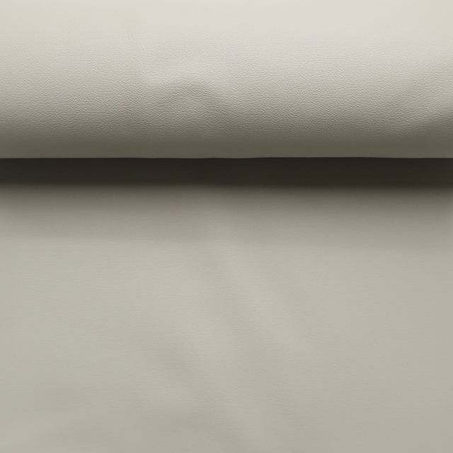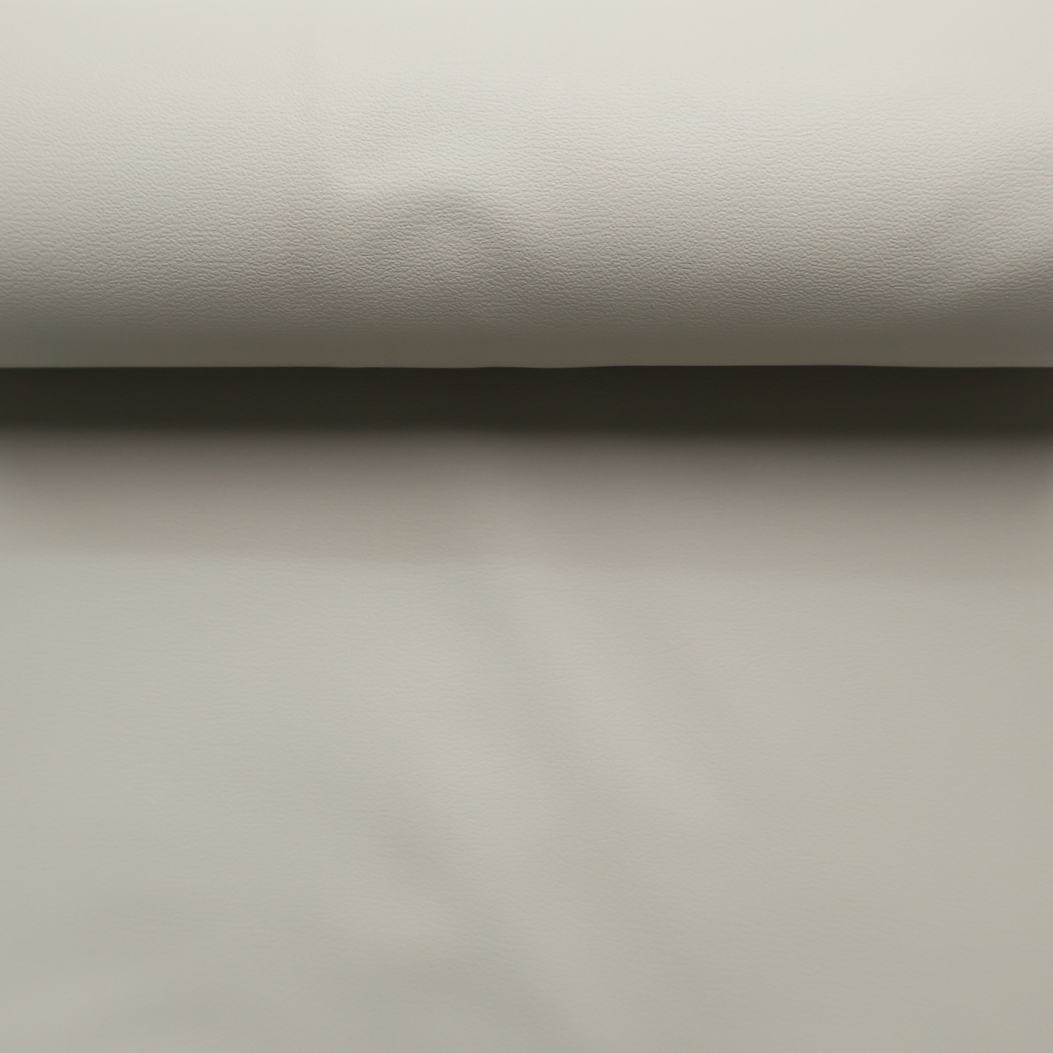 This light gray beige faux leather upholstery fabric features a smooth leather-like surface with a subtle grain texture, offering a clean and neutral appearance. The backside is reinforced with a polyester fabric backing, providing stability and durability while keeping the fabric easy to handle. Its medium weight makes it versatile for both functional and decorative projects.