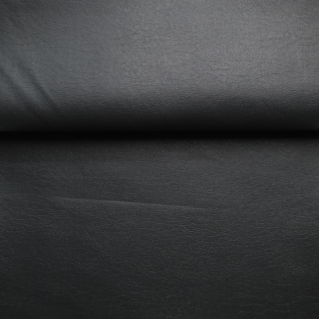 This black faux leather upholstery fabric features a smooth leather-like surface with a subtle texture, offering a sleek and modern look. The backside is reinforced with a white non-woven fabric backing, providing extra stability, durability, and ease of use for sewing and upholstery applications. Softer and more flexible than traditional vinyl, it is ideal for projects that require both elegance and practicality.