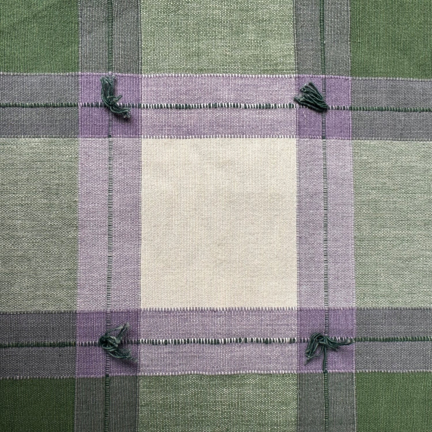 - A classic large-scale check/plaid pattern with subtle tufted yarn accents at intersections, offering a refined yet cozy look